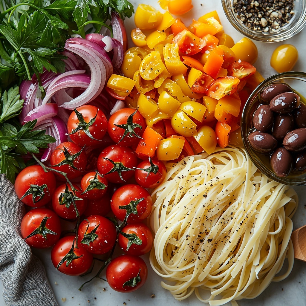 While the pasta cools, slice the cherry tomatoes in half for juicy bursts of flavor, thinly slice an assortment of colorful bell peppers for crispness and a sweet touch, finely dice the red onion to add a gentle bite, and chop fresh parsley for a bright herbal finish. Prepping these veggies nicely sets the stage for a visually inviting and flavor-packed salad.