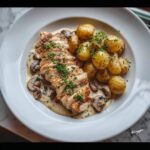 A creamy and savory Chestnut Garlic Greek Chicken Alfredo served with roasted sage-infused baby potatoes and a vibrant mushroom basil pesto. This dish combines tender seared chicken, a rich chestnut and garlic Greek yogurt Alfredo sauce, earthy roasted potatoes, and a fresh homemade pesto for a satisfying and flavorful meal perfect for a cozy dinner.