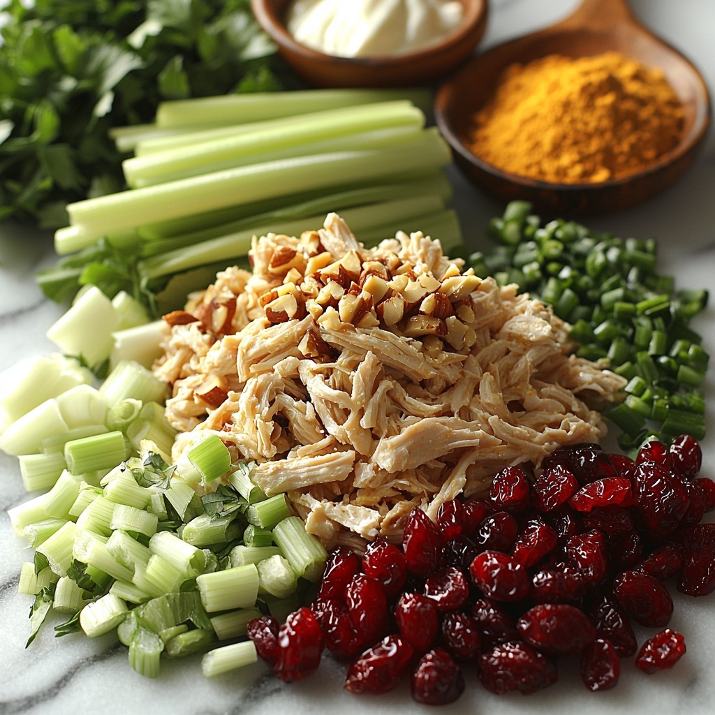The magic of the Curried Chicken Salad with Cranberries Recipe lies in its simple but thoughtfully chosen ingredients. Each one plays an important role, whether contributing texture, flavor, or that beautiful pop of color that draws you in even before the first bite.