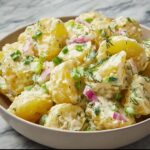 A tangy and creamy Dill Pickle Potato Salad perfect for summer picnics and potlucks, featuring tender baby potatoes mixed with diced dill pickles, boiled eggs, fresh herbs, and a zesty dressing made with mayonnaise, sour cream, and Dijon mustard.