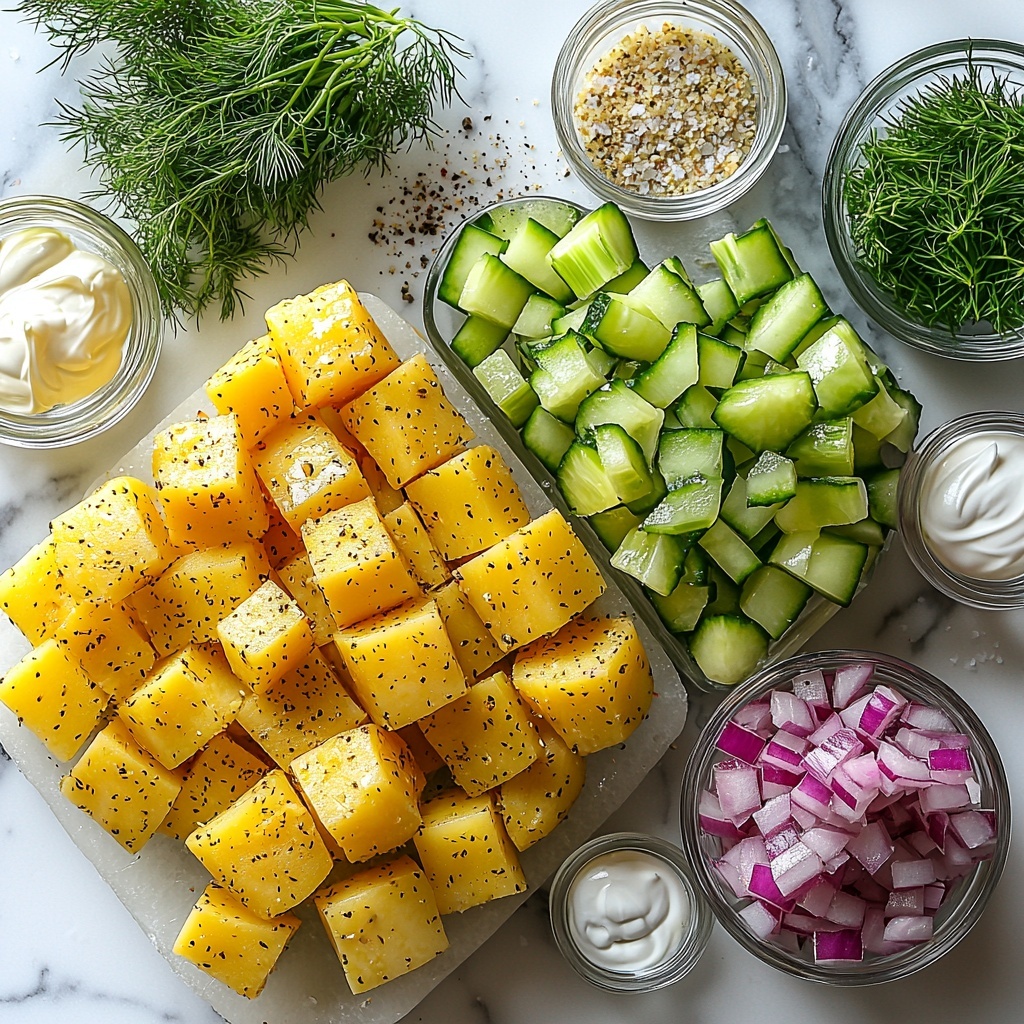 Gathering the right ingredients is key to nailing this Dill Pickle Potato Salad Recipe. Each component plays a crucial role: from the tender potatoes that offer a creamy base, to the crisp celery and sharp red onion adding delightful texture, and of course, the tangy dill pickles and fresh dill that make this salad stand out.