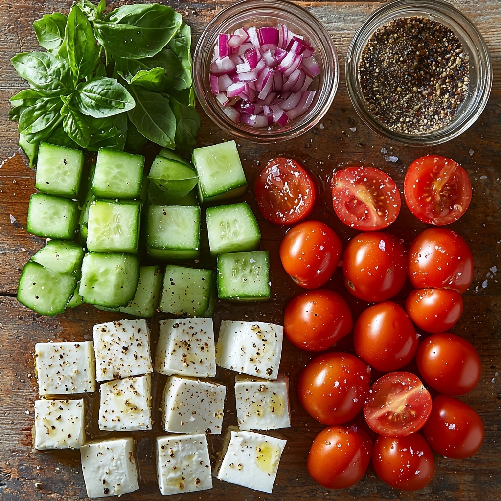 Peel the cucumber and dice it after giving it a quick fork scoring to enhance texture and better absorb the dressing. Quarter the cherry tomatoes to release their luscious juices. Chop the red onion finely to disperse its flavor evenly without overpowering the salad.