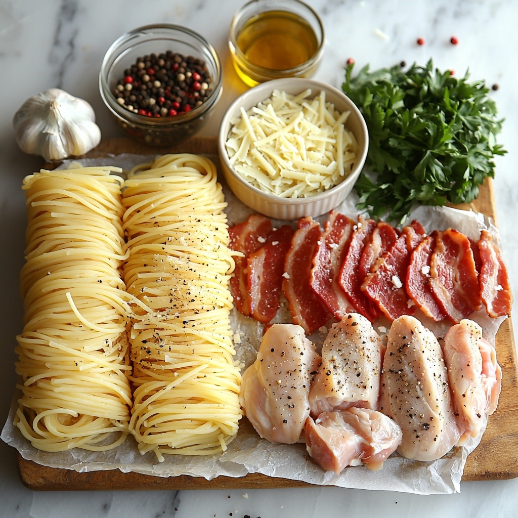 - Combine Ingredients: Add the cooked spaghetti, sliced chicken breasts, and crumbled bacon to the sauce. Toss gently to coat everything evenly with the creamy sauce.