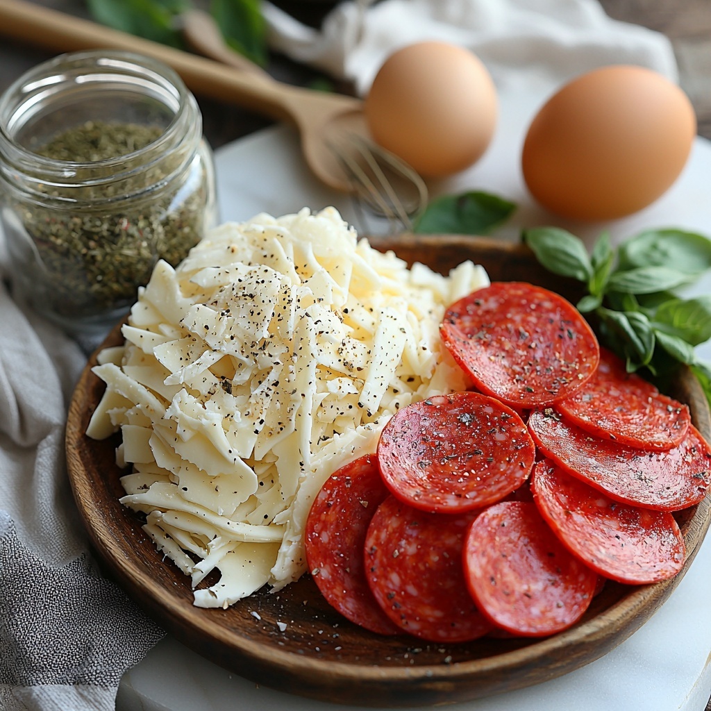 2. Mix Ingredients: In a mixing bowl, combine shredded mozzarella cheese, sliced pepperoni, and Italian seasoning. Stir thoroughly until all the ingredients are evenly mixed. You may add the egg at this stage if using it to help bind the mixture.
