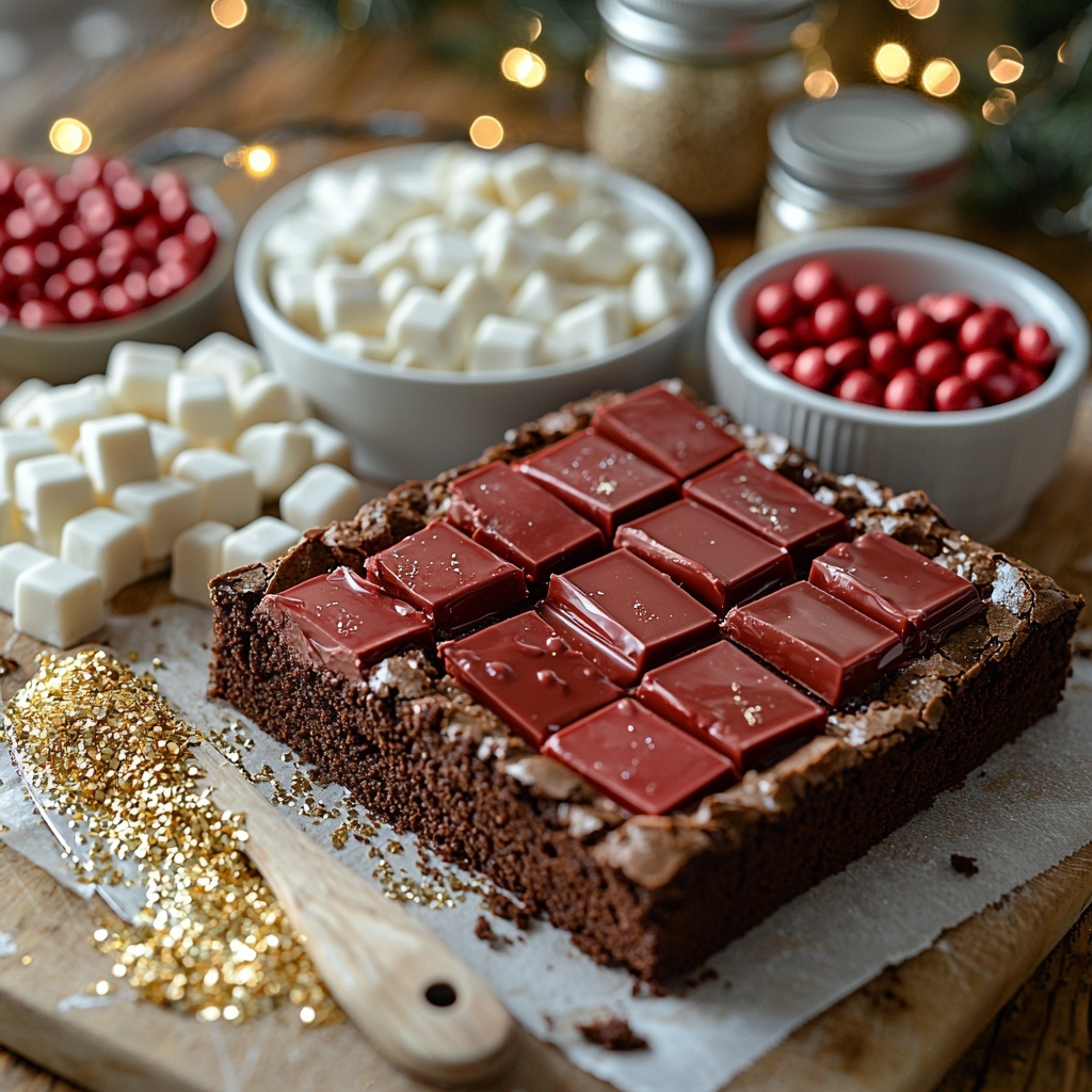- Prepare Decorations: Brush each mini chocolate square with edible gold luster dust or spray to give them a festive metallic shine. These will form the “buckles” on the Santa belly brownies.