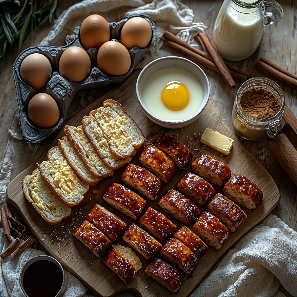 These ingredients are simple staples you likely have on hand, yet each plays a vital role in crafting the perfect balance of flavors and textures. The bread provides the soft, slightly sweet base, while the sausage adds a savory punch, and the cinnamon-spiced egg mixture gives every bite that comforting French toast charm.