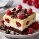 Once your sponge is completely cool, pour the white chocolate mixture evenly over the top. Scatter fresh raspberries on the surface, pressing them gently into the glossy topping so they stick. For an elegant touch, dust with powdered sugar if you like. Allow the topping to set for 30 minutes to an hour before slicing into squares.